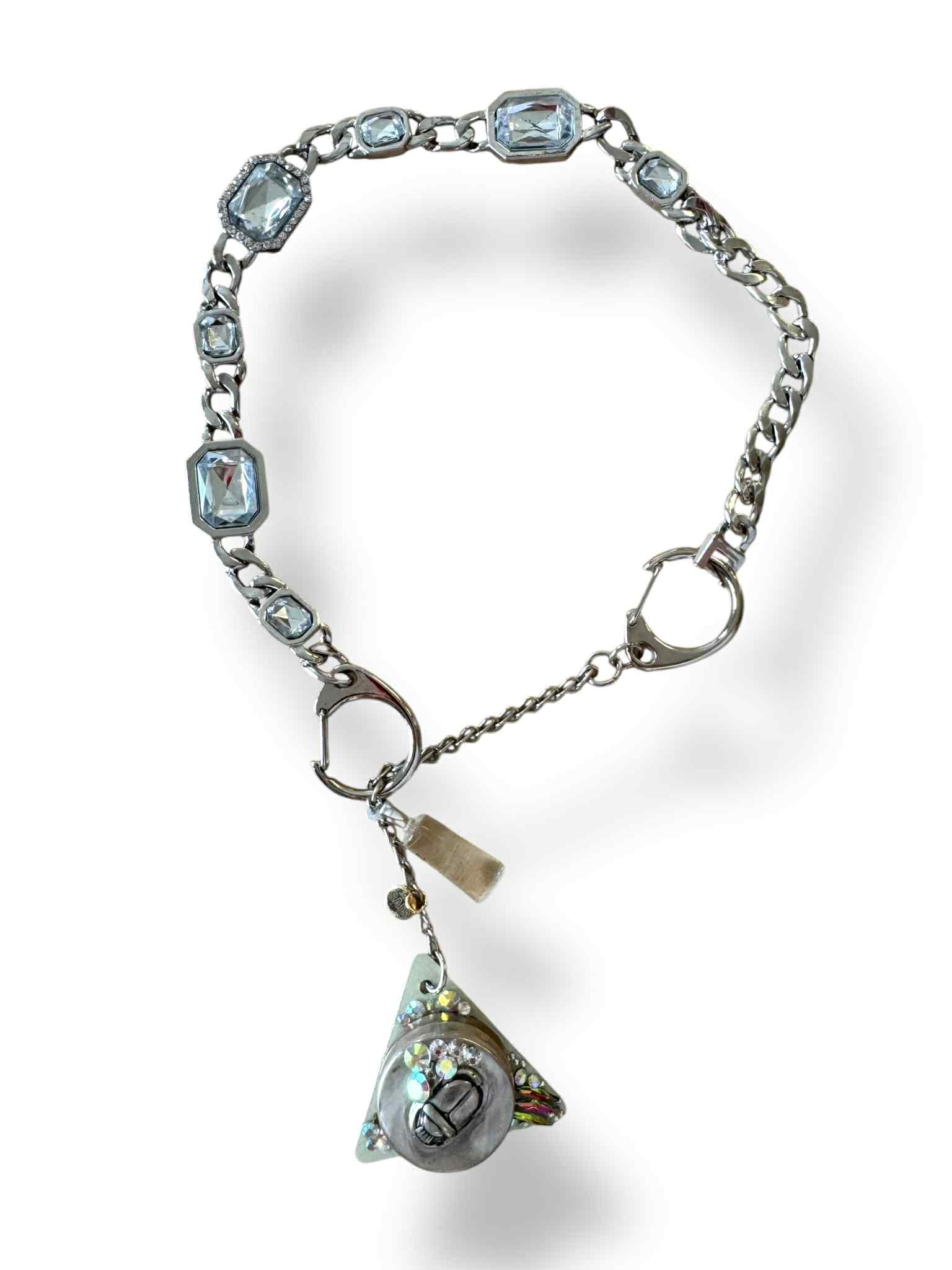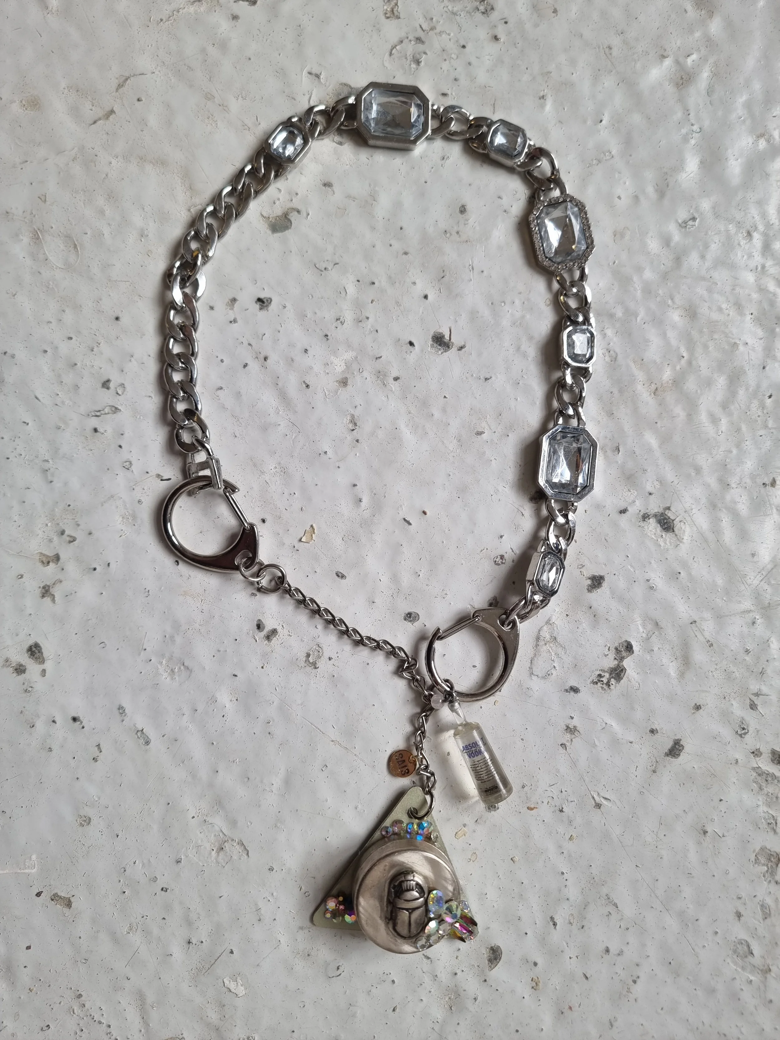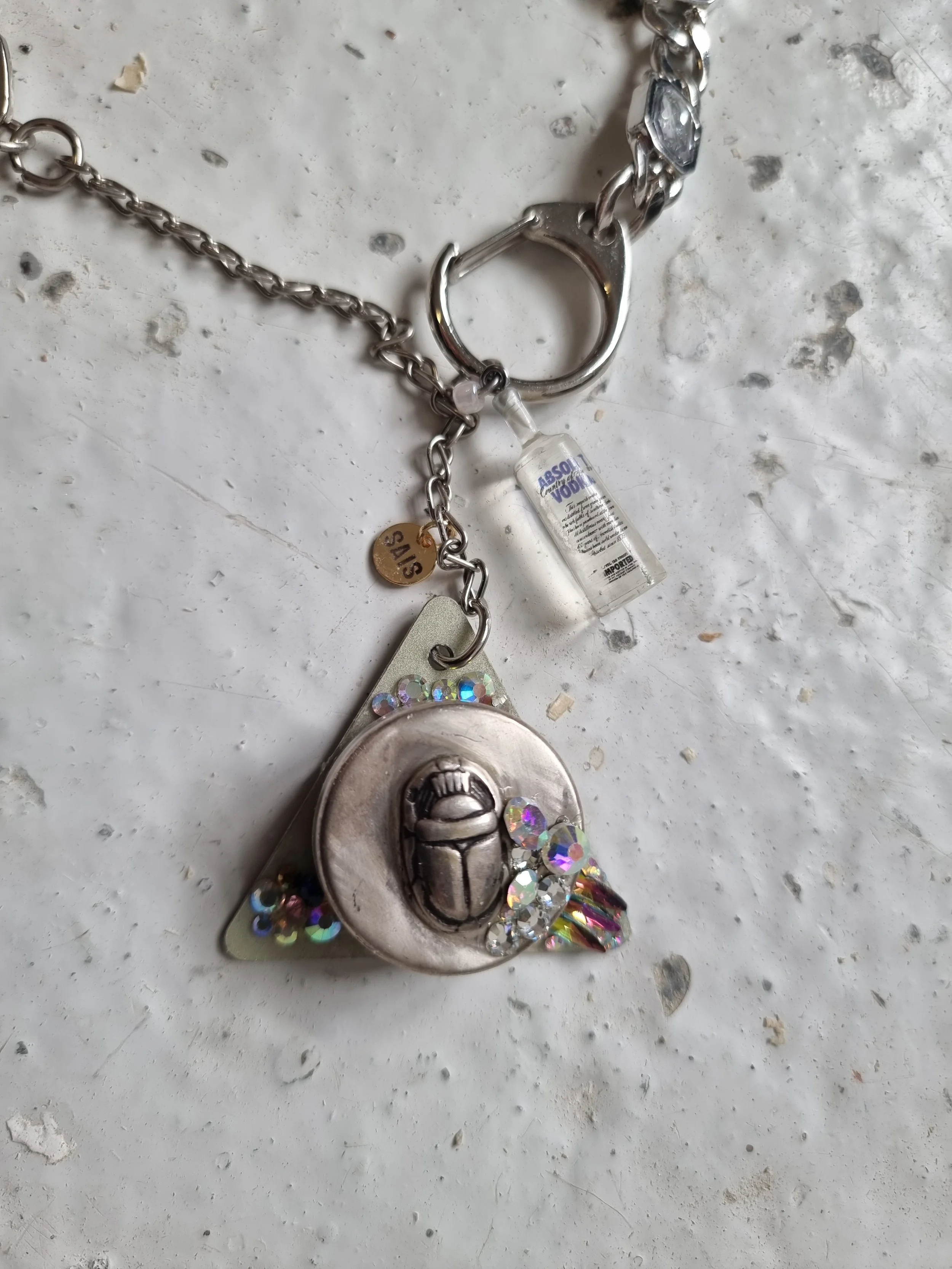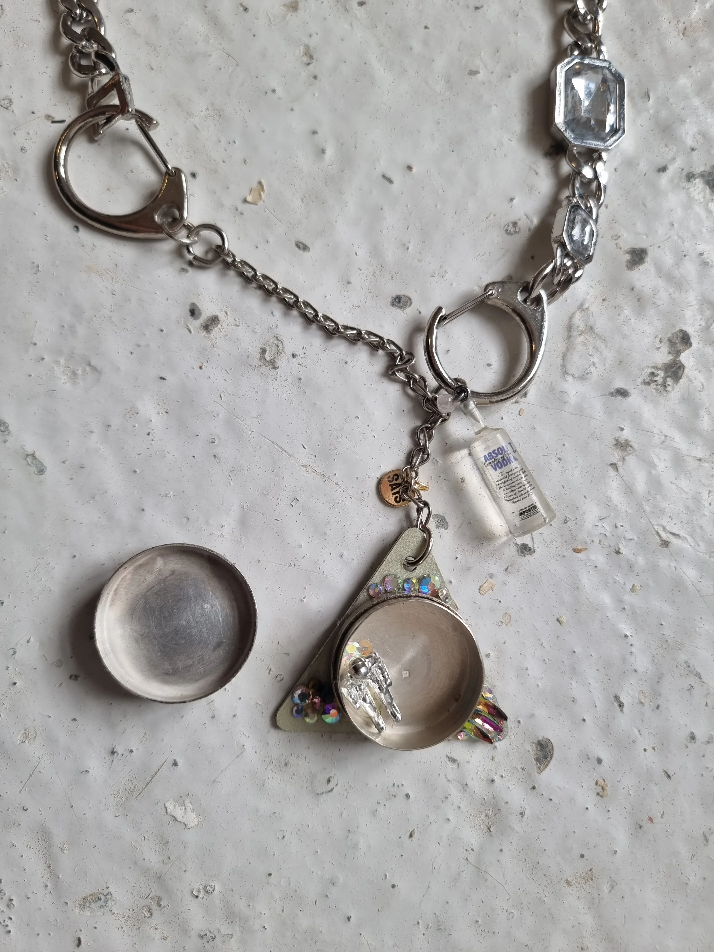 1 of 1, handmade piece of carefully assembled materials. A small man resides inside a box, and a Vodka bottle dangles on one side…